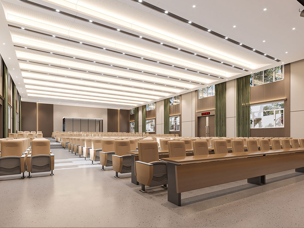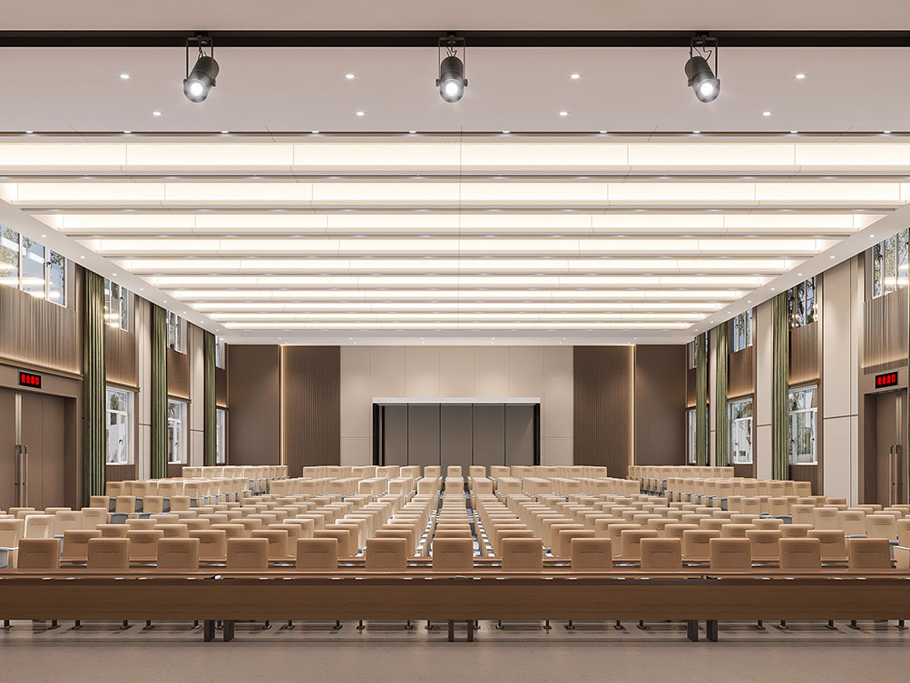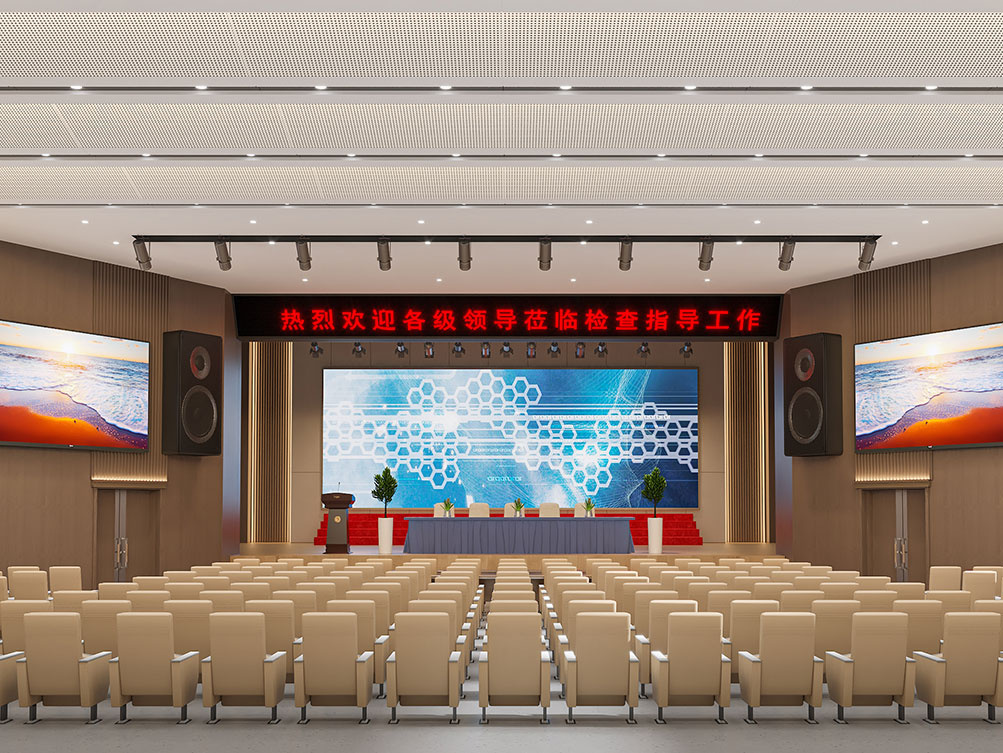 設計理念: 作為濟南辦公室裝修中大型功能空間的代表,該大堂報告廳以沉穩木飾面 + 金屬線條鋪陳基調,頂部穿孔吊頂搭配嵌入式燈光,兼顧聲學與視覺通透感。巨幅電子屏 + 對稱音響設備適配會議、匯報需求,米色座椅與紅色臺階營造莊重又舒適的氛圍,是濟南辦公室裝修中高規格功能空間的典型設計。